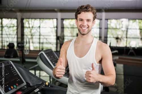 Obraz premium Happy man showing his thumbs up at gym