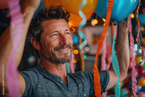 © cochisevisuals, Obraz premium Happy man smiling with balloons and streamers at a celebration.