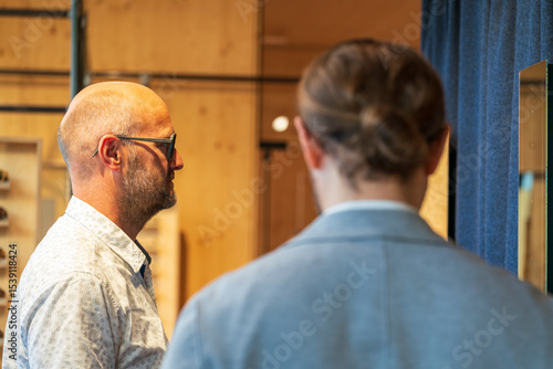 © Wolfgang Hauke, Obraz premium Happy man with bald head and sun glasses at shop