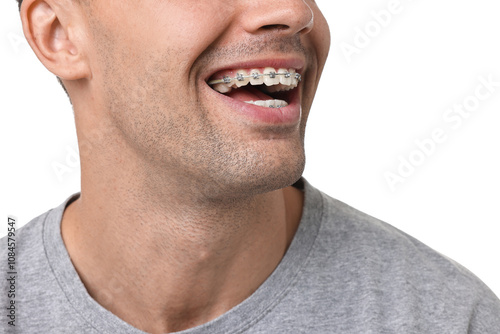 Obraz premium Happy man with dental braces on white background, closeup