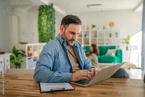 © Miljan Živković, Obraz premium Happy man working remotely from home enjoying family time