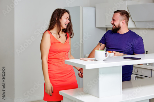 Fototapeta premium Happy married couple eat breakfast in kitchen.