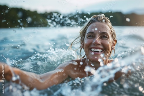 Obraz premium Happy mature woman having fun in lake