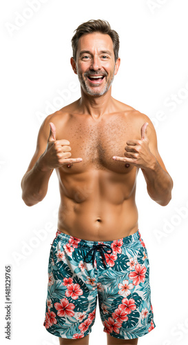 © SimpleDesignStudio, Fototapeta premium Happy middle-aged shirtless Caucasian man in floral swim trunks making shaka gesture with both hands, smiling enthusiastically at camera on a plain transparent background, exuding summer vibes.