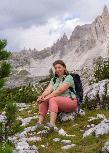 Naklejka premium Happy middle aged woman enjoying beautiful view of high cliffs. Sitting on rock. Healthy lifestyle concept, hiking, tourism. Dolomite Alps, South Tyrol, Italy