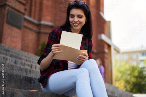 Fototapeta premium Happy millennial student with yellow envelope reading received mail notification during daytime in city, Caucasian hipster girl checking message and correspondence holding postal paper and postcard