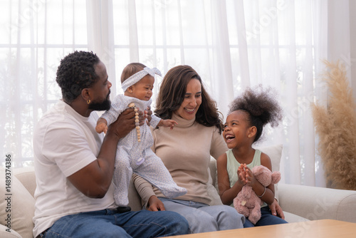 © ultramansk, Fototapeta premium Happy mixed race family sitting on the living room floor, smiling and enjoying time together at home with their kids and baby in a warm, bright, cozy atmosphere.