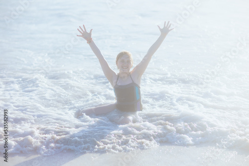 Naklejka premium happy modern teen at beach in beachwear rejoicing