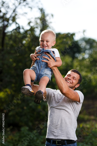 Fototapeta premium Happy moments. Father throws up his son in the sky at sunset in nature.