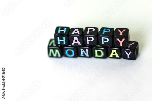 Obraz premium Happy Monday of blocks on white page open notebook on desktop