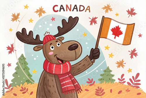 © Olga, Naklejka premium Happy moose with Canadian flag illustration for Canada Day