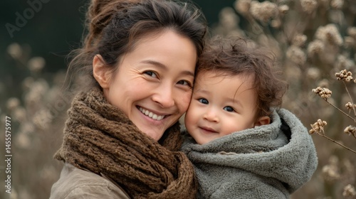 Obraz premium Happy mother and baby smiling outdoors in winter