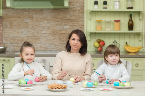Fototapeta premium Happy mother and child paint Easter eggs on the kitchen table