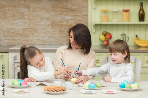 Fototapeta premium Happy mother and child paint Easter eggs on the kitchen table