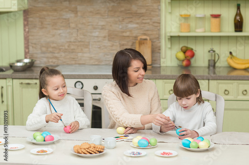 Fototapeta premium Happy mother and child paint Easter eggs on the kitchen table