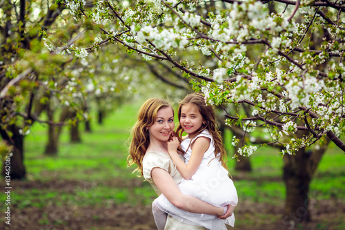 Fototapeta premium Happy mother and daughter in the flowered garden