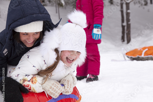 © korobula, Obraz premium Happy mother and daughter laughing and rolling with snow hill.