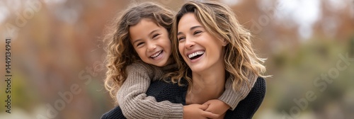 © Mikael, Obraz premium Happy Mother and Daughter Outdoors, piggyback ride, autumn park, family portrait