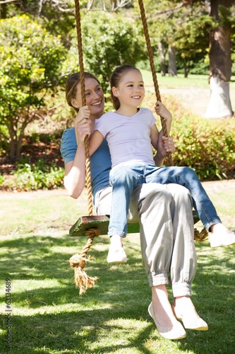 Obraz premium Happy mother and daughter sitting on swing at park