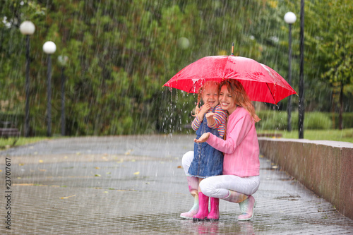 © New Africa, Fototapeta premium Happy mother and daughter with red umbrella in park on rainy day. Space for text