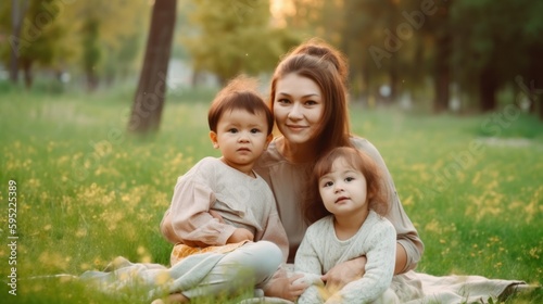 Fototapeta premium Happy mother holding babies in the park. Generative AI