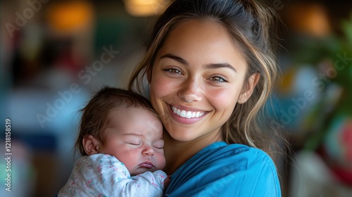 © YZN, Fototapeta premium Happy mother holding sleeping baby in cafe