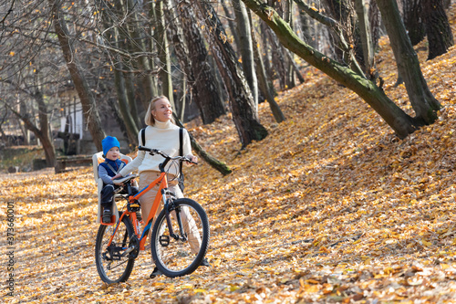 © LALSSTOCK, Fototapeta premium Happy mother leads a bicycle with a child strapped in the back in the autumn park.
