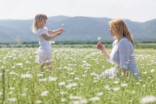 © Alena Ozerova, Fototapeta premium Happy mother playing with her daughter in flower field