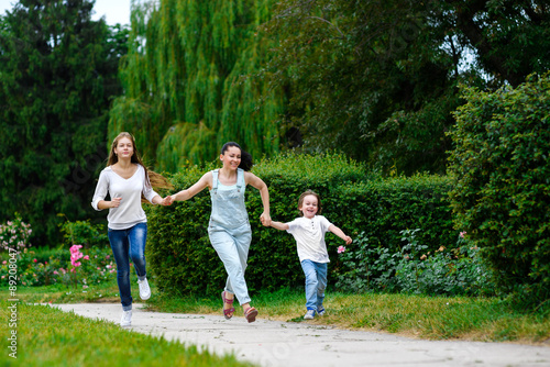 © Kostiantyn, Obraz premium Happy Mother with daughter and son running on grass smiling