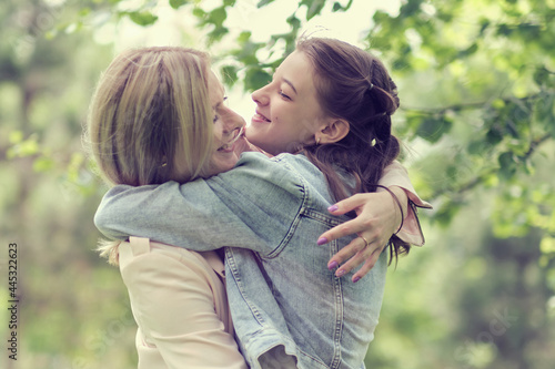 Fototapeta premium happy mother with her daughter hugging a teenager in the summer. Caring happy mother enjoy day with teenage girl child, laugh have fun. Mother giving her daughter advice.