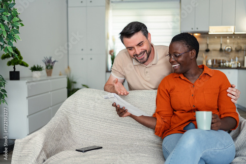 © Jelena, Fototapeta premium Happy multi-ethnic couple reading good news at home sitting on the sofa