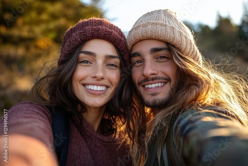 © app, Obraz premium Happy multiethnic friends taking outdoor selfie on hiking trail