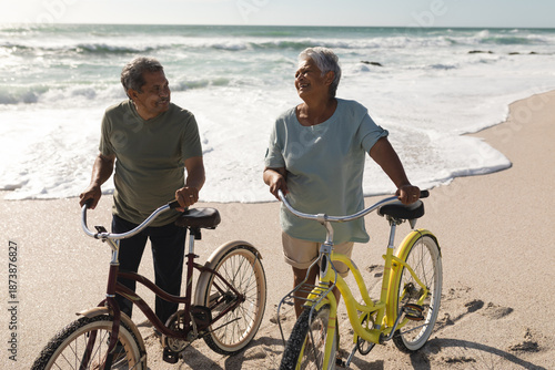 © wavebreak3, Fototapeta premium Happy multiracial senior couple talking while wheeling bicycles on shore at beach during sunny day