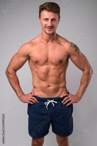 © Ranta Images, Fototapeta premium Happy muscular bearded man shirtless smiling against white background