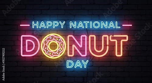 © MstRuzina, Obraz premium Happy national donut day neon sign on brick wall background