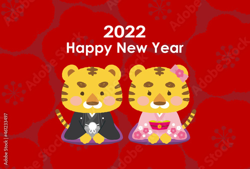 © kuroshimaharu, Fototapeta premium イラスト素材:年賀状2022テンプレート 寅の和装カップル 背景赤梅柄 happy new year