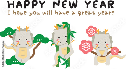 Fototapeta premium 2024年 白竜の年賀状 松竹梅 Happy New Year 手書き風文字メッセージ英語