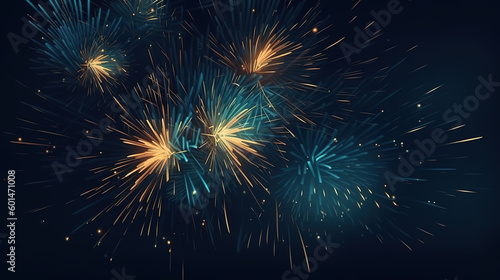 Naklejka premium Happy New Year Abstract background with Golden fireworks. Bright on dark blue background. Generative ai