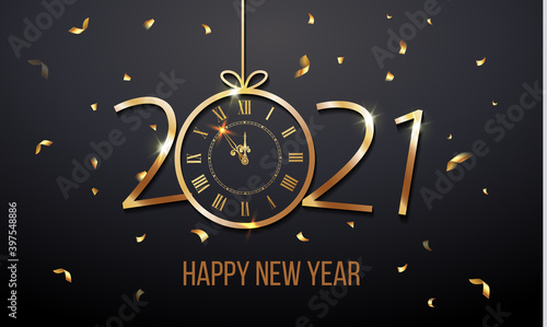 © nikelser, Fototapeta premium Happy New Year 2021 and Christmas card with golden text and clock. Vector. Vector illustration