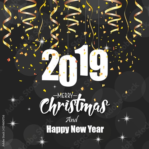 Fototapeta premium 2019 Happy New Year and Merry Christmas greeting card with falling golden confetti and ribbon