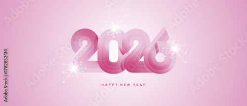 © simbos, Naklejka premium Happy New Year 2026. Black type typography in the shape of a ribbon for the year 2026 with sparkle fireworks. Abstract neon light and pink background