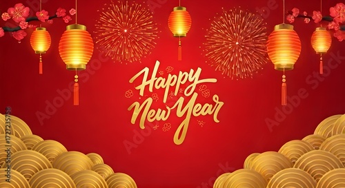 Naklejka premium Happy New Year card with festive Chinese lanterns, fireworks, and golden...