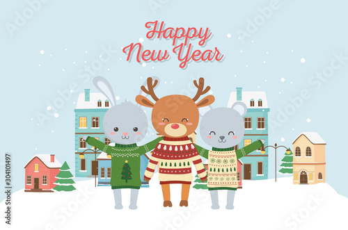 Fototapeta premium happy new year 2020 celebration cute deer rabbit bear town sown