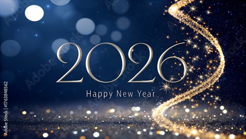 Fototapeta premium Happy new year 2026 celebration with golden sparkling lights and bokeh effect on dark blue background