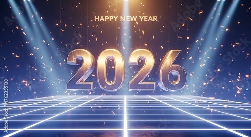 © Faruk, Naklejka premium Happy New Year 2026 celebration with golden text and confetti background