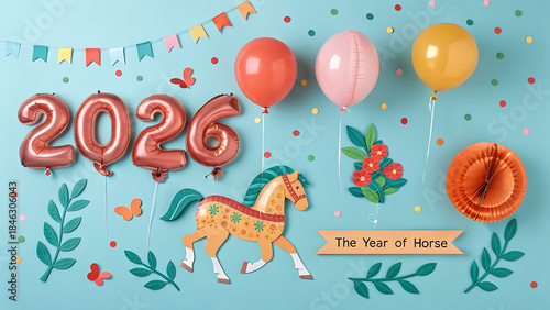 Fototapeta premium Happy new year 2026 celebration with horse zodiac balloons and decorations