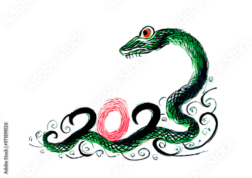 © k_yu, Obraz premium Happy New Year 2025. Colorful snake on abstract background.
