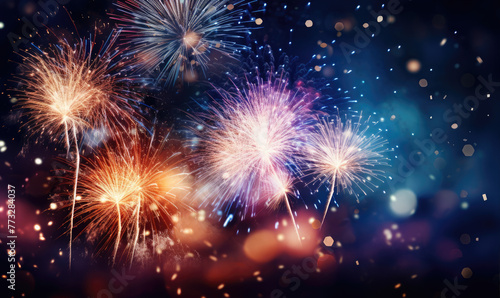 Naklejka premium Happy New Year concept, glasses with sparkling champagne, amazing fireworks...
