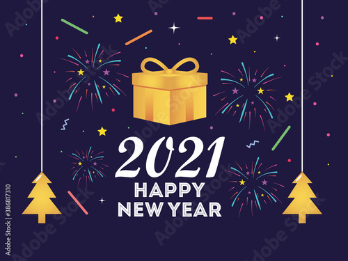 © Jeronimo Ramos, Naklejka premium 2021 happy new year creative card gold gift hanging trees and fireworks