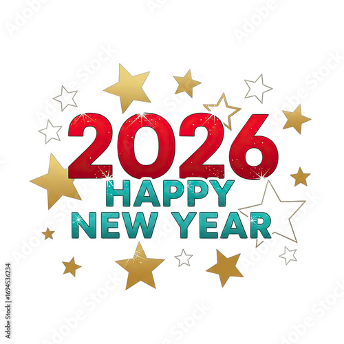 Fototapeta premium Happy New Year 2026, Festive Gold Stars, Red Bold Numbers on Transparent Backdrop